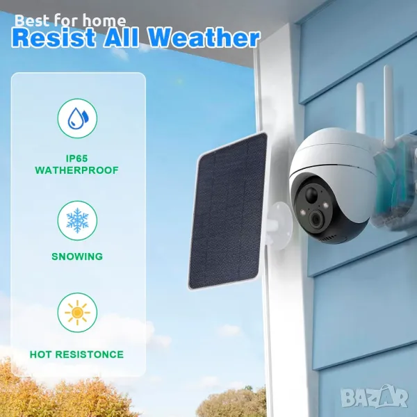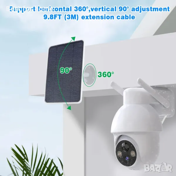 Устойчивост на всякакви метеорологични условия: Камерата със слънчев панел е IP65 водоустойчива и може да устои на всякакви метеорологични условия, включително дъжд, сняг, гръмотевична буря. Този соларен панел за камера с батерии със захранващ кабел от 9,84 фута, завъртане на 360 градуса и регулируема на 90 градуса стойка за стена ви позволява за да изберете най-добрата позиция за вашия панел за получаване на пряка слънчева светлина.