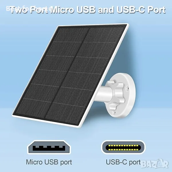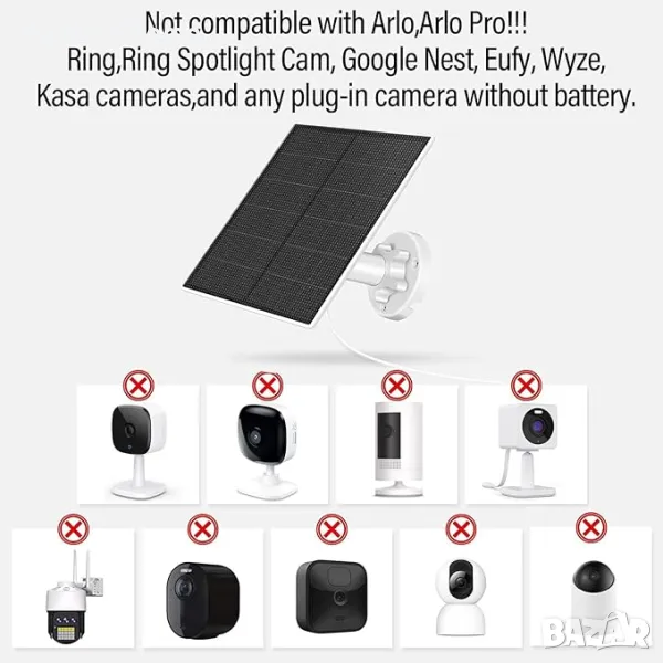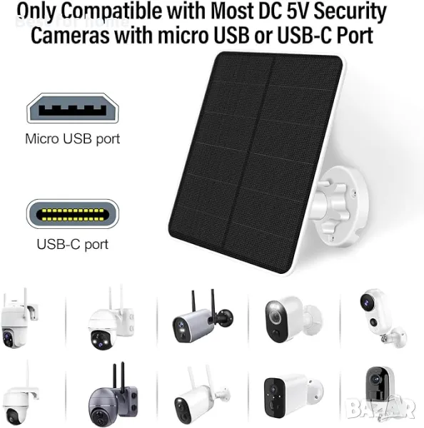 Съвместим с DC 5V външна камера с акумулаторна батерия с Micro USB или USB-C порт: 5w соларен панел, съвместим с DC 5V външна камера с акумулаторна батерия с Micro USB или USB -C порт камера, Не е съвместим с Arlo, Arlo Pro!!!, Камери Ring, Ring Spotlight Cam, Google Nest,