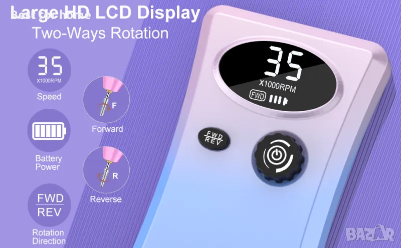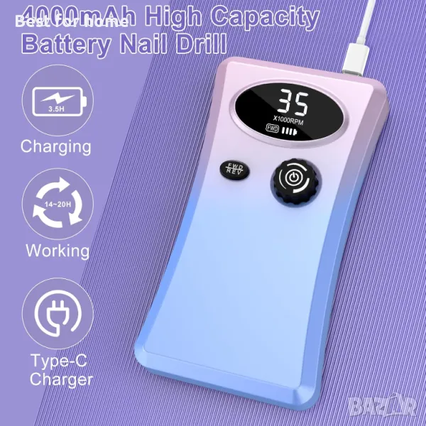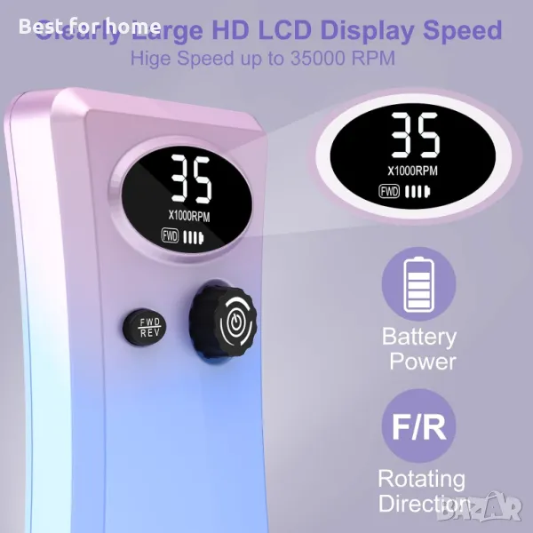 【35 000 RPM Регулируеми високоскоростни лагери】: 0-35 000 RPM бормашина за нокти с въртящо се копче и LED екран, който показва оставащата батерия. Предварителна и обратна посока, свободно избираема (F/R), подходяща за лява и дясна ръка. С висококачествен двигател и чип, фрезата е винаги стабилна и с ниско ниво на вибрации.