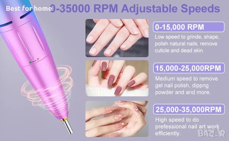【Лесен за работа】Бутон с едно докосване поддържа показване на мощността и промяна на посоката напред/назад със скорост, показваща се на LCD екрана, както професионалисти, така и начинаещи могат лесно да работят с тази машина за пробиване на нокти. Професионалната шлифовъчна машина за нокти улеснява пълненето и отстраняването на акрил.