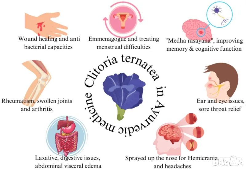 Клитория тернатея не е токсична, така че е противопоказна само при индивидуална непоносимост към компонентите, алергични реакции, по време на бременност, кърмене и при деца. Произход: Шри Ланка