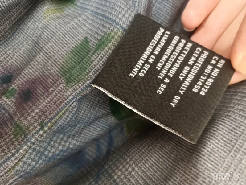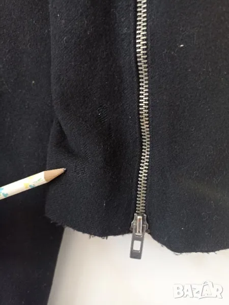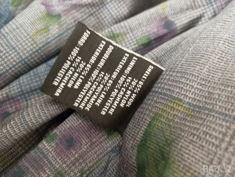 Вълна и кашмир. Полиестерна подплата на цветя.Два джоба.Джоб с цип.Отзад има цип и се отваря.С отбелязани забележки.При носене не се открояват.