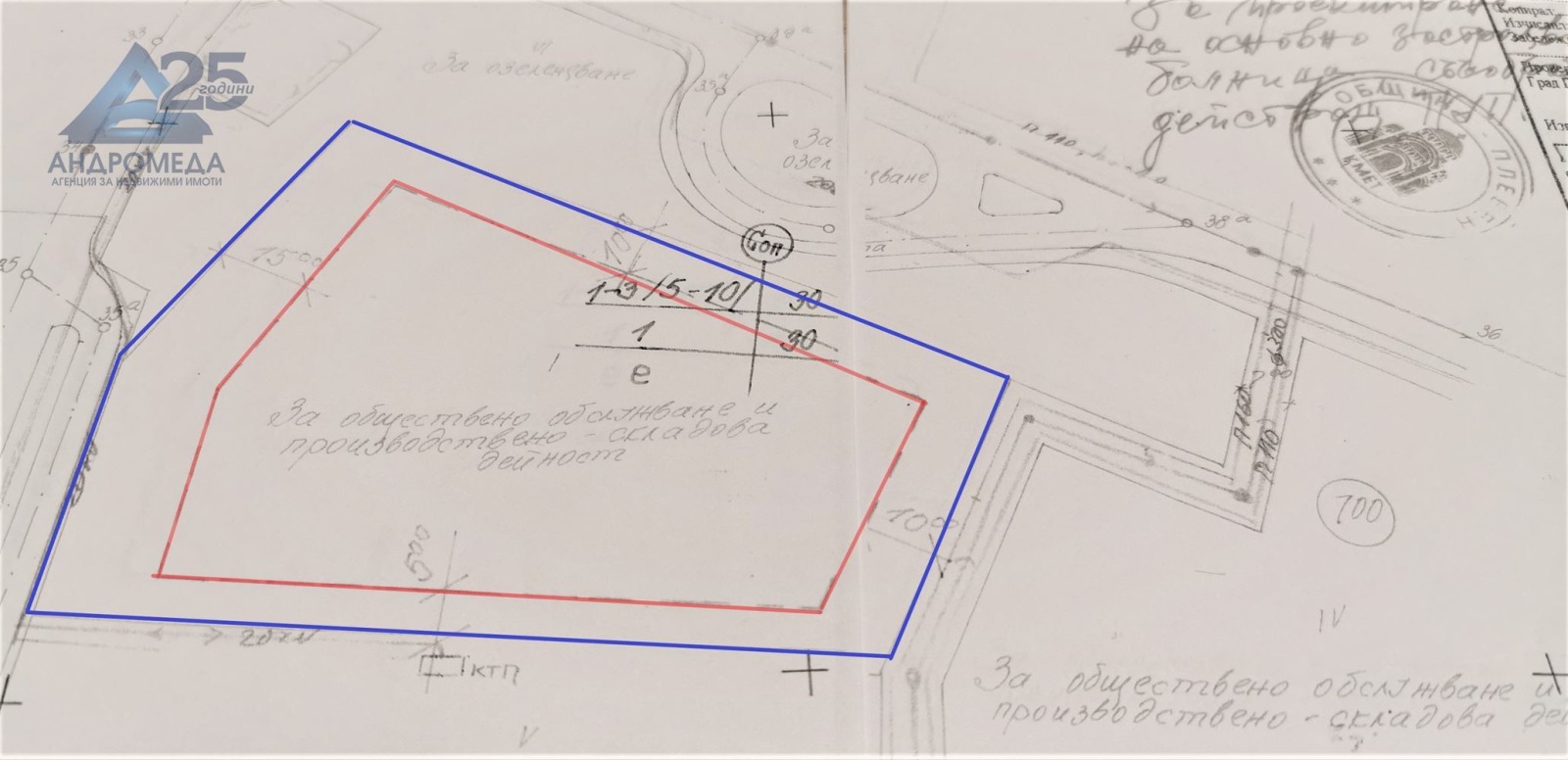 Парцел - поземлен имот площ 8270 кв.м., урбанизирана територия, начин на трайно ползване - за друг обществен обект, комплекс, влязъл в сила ПУП - ПРЗ, с параметри на застрояване ЗП 30 % - 2480 кв.м., озеленяване 30 %, кинт 1,0, отреден за обществено обслужване, търговия, спедиция, складова дейност и безвредни производства, подходящ за застрояване на търговски сгради, крайпътни обекти, бензиностанция, шоурум, представителство на земеделска техника или други, издадена виза за проектиране на болнично заведение, достъп от асфалтов път от една страна, и втори достъп от второстепенен път (неизграден) ! Застрояване предвидено с ПУП е възможно да се промени в рамките на ЗУТ ! Посочената цена е без ДДС ! Линк за 360 градуса изглед от високо - https://kuula.co/share/7W2VP?fs=1&vr=0&sd=1&thumbs=1&info=1&logo=0 (премахнете паузите ако има такива). Оферта ЕА3460 Plot of land - land area 8270 sq.m., urbanized territory, way of permanent use - for another public site, complex, entered into force PUP - PPP, with building parameters ZP 30% - 2480 sq.m., landscaping 30% , intensity 1.0, designated for public service, trade, forwarding, warehousing and harmless production, suitable for construction of commercial buildings, roadside sites, gas station, showroom, representation of agricultural machinery or others, issued visa for the design of a hospital, access from an asphalt road on one side, and a second access from a secondary road (unbuilt)! Construction provided for in the Detailed Urban Plan may change within the Spatial Development Act! The indicated price is without VAT! Link for 360 degree view from above - https://kuula.co/share/7W2VP?fs=1&vr=0&sd=1&thumbs=1&info=1&logo=0 (remove pauses if any). Offer EA3460