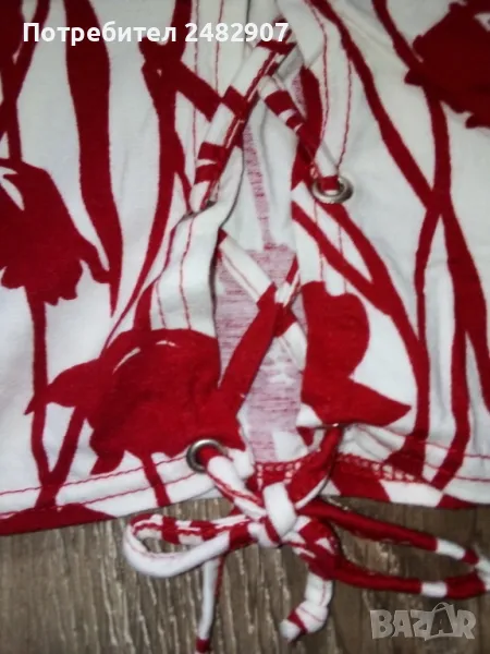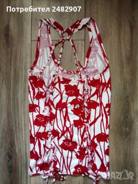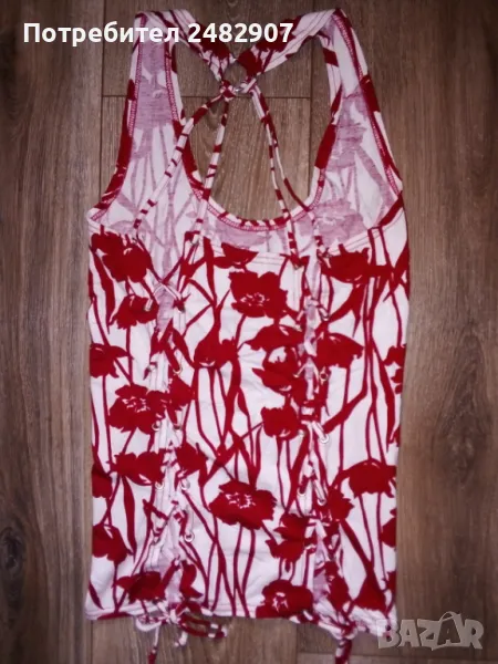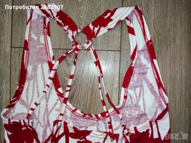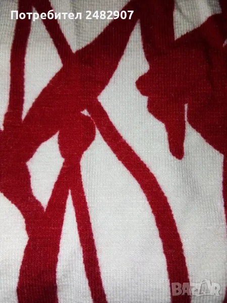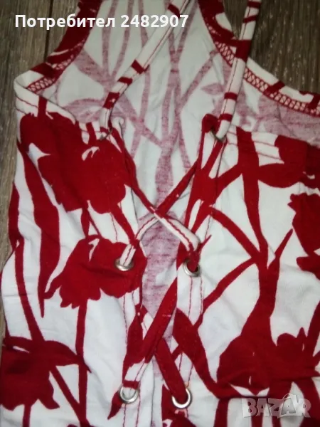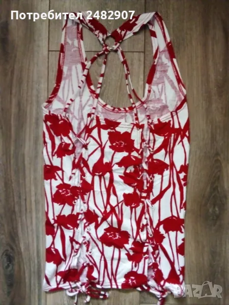 Ефектен дамски потник в червено и бяло, размер S. Ширина в раменете - 19 см, ширина под мишниците - 29 см, ширина в долната част - 31 см, дължина от рамото до долу - 57 см. Много запазен, обличан е веднъж за повод, отлично състояние, без забележки, с връзки на гърба.