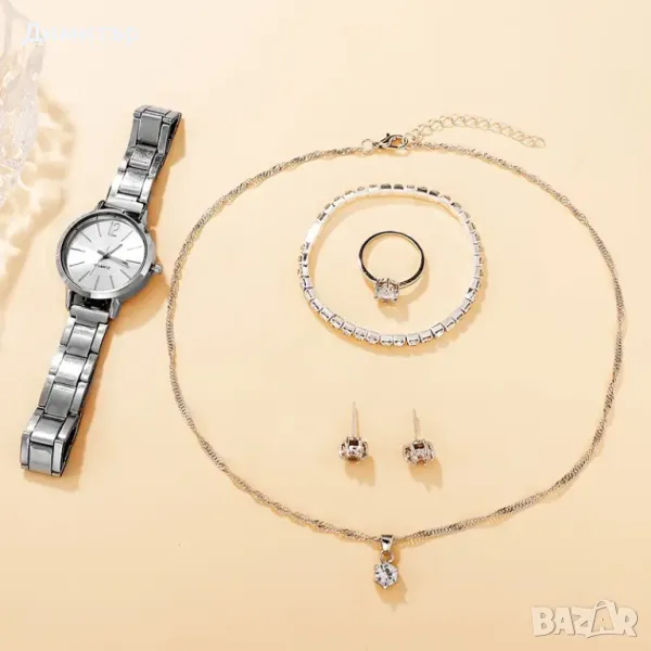 Нов комплект дамски часовник, колие, гривна, обеци и пръстен → Обява 47041458