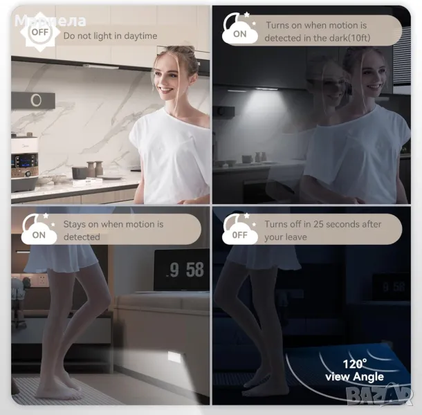 Гъвкава светлина със сензор за движение на закрито: В сензорен режим тези светлини под шкафа се включват безжично автоматично, когато се засече човешко движение в рамките на 120° и в тъмна среда или среда с ниска осветеност, и се изключват автоматично след около 28 секунди без засичане на движение .