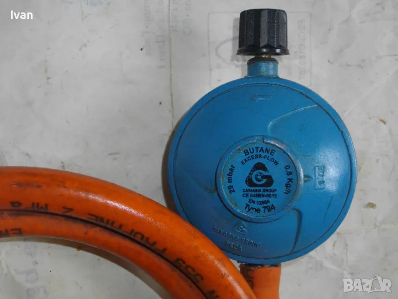 ОПИСАНИЕ на газов редуцир вентил клапан налягане син цвят с маркуч - цена 79 лв. Ползван, в добро състояние. Вентил марка и характрестики - CAVAGNA GROUP RECA Type 794 - 29 mbar - 0,8 kg h Butane. Вентила е за ниско налягане. Скачен маркуч оригинален 60 см, ф 10 мм външен размер, вътрешен ф 8 мм, отличен - Propane 20 bar.