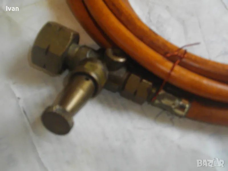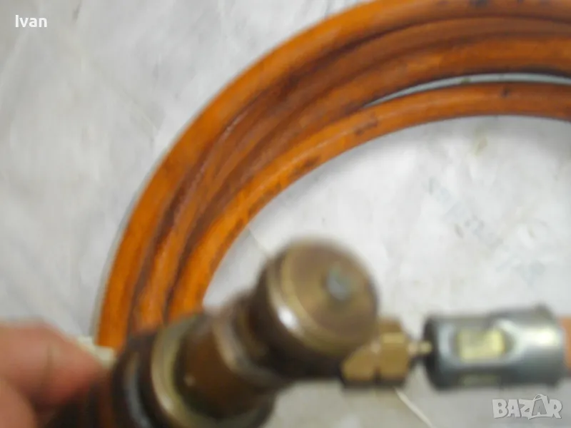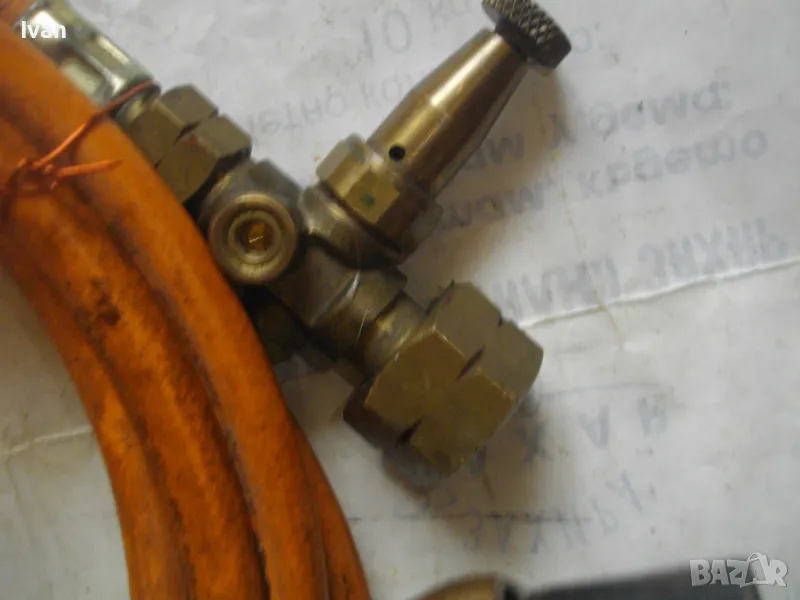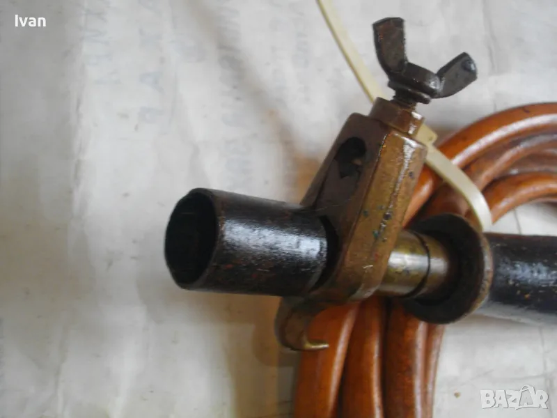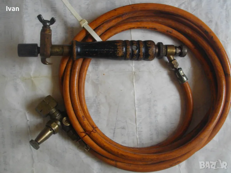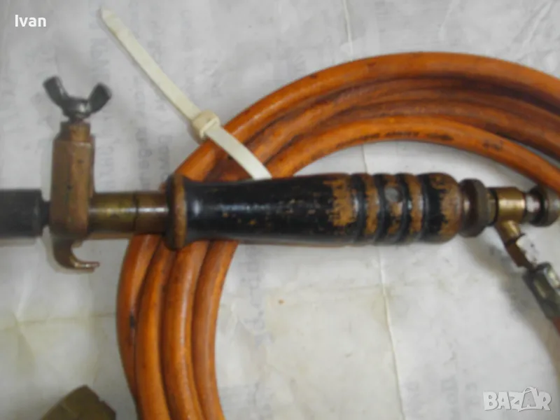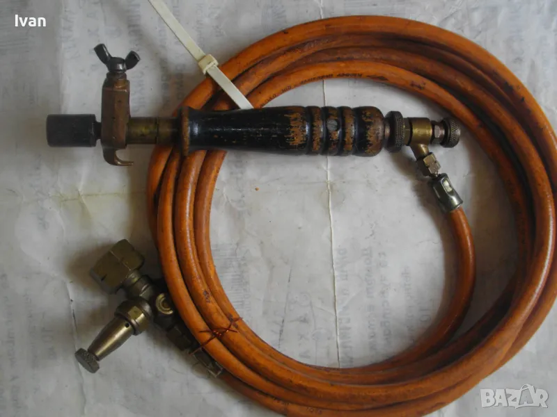 ОПИСАНИЕ горелка дървено покритие 260 мм. Цена 249 лв. Старо немско качество. Отлично техническо състояние. Дължина горелка - 260 мм, бронз изцяло с дървено покритие ръкохватка. Въртеливост изцяло, регулация отзад.Чашка дюза отпред ф 20 мм.. Маркуч скачен 3 м, отличен, без напуквания. Редуцир вентил клапан налягане скачен - оригинален, немски, промишлен - Leber Industre, масивен изцяло бронзов, голям, със спирателен кран. Маркуч размер вътрешен ф 8мм.
