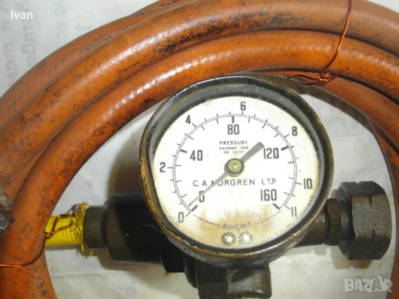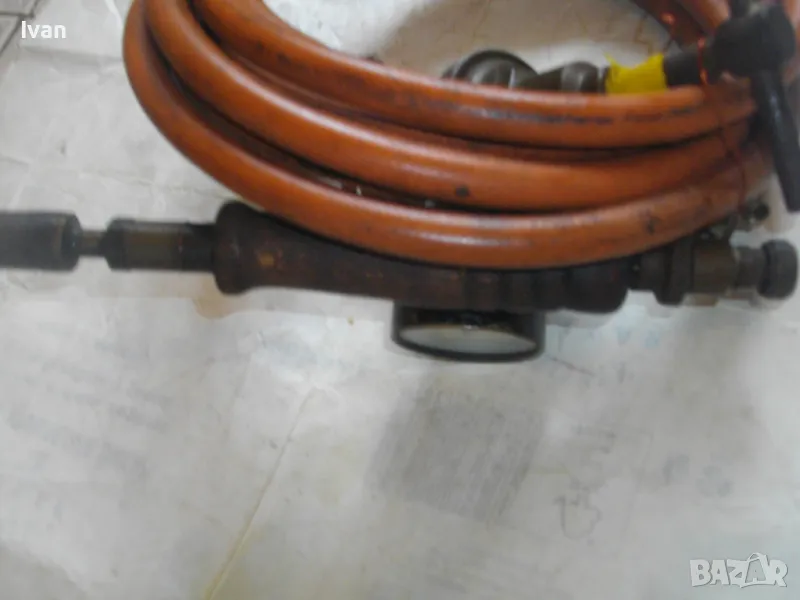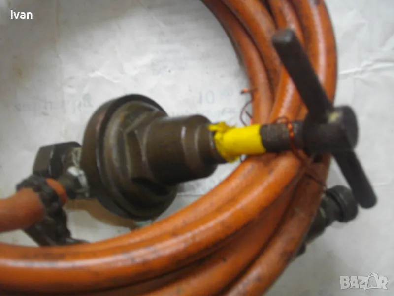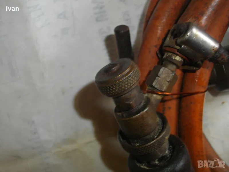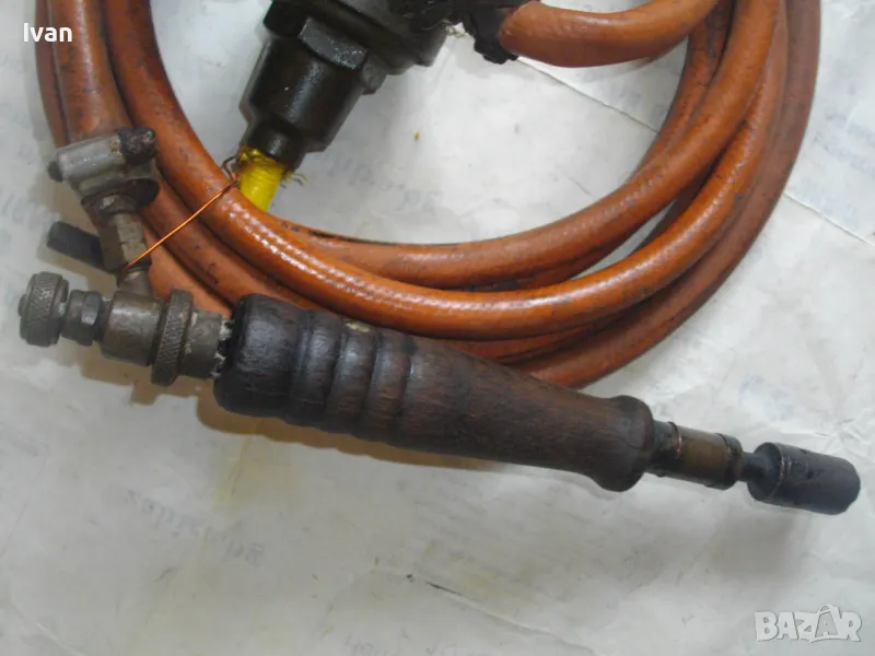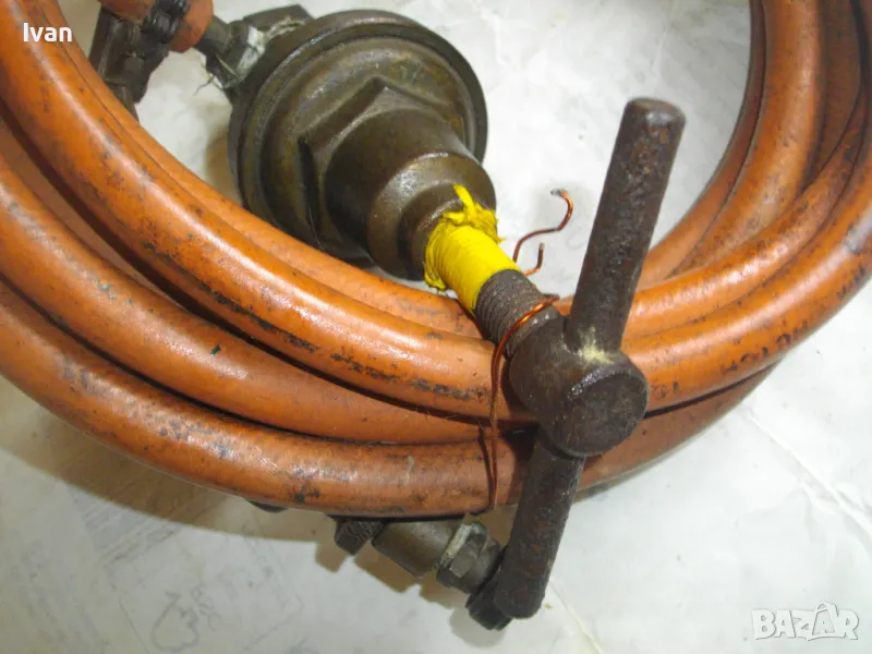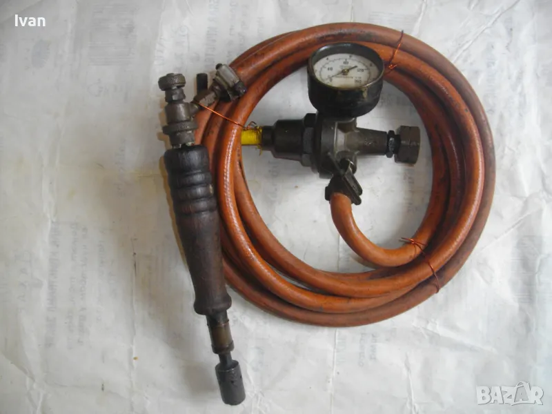 ОПИСАНИЕ на газова горелка 265 мм с вентил с манометър - цена 199 лв. Немско старо качество. Дължина горелка 265 мм, бронз изцяло, регулация отзад, въртеливост. Дървено покритие на дръжката, чашка дюза отпред - ф 18 мм. Маркуч скачен - 3 м, отлично състояние, без напуквания. Редуцир вентил клапан налягане скачен - оригинален старо качество - отличен - голям, масивен, бронз изцяло, с манометър ф 60 мм C.A. Nurgren - 0-11 bar. Спирателен върток голям. Маркуч размер вътрешен диаметър ф 10 мм.