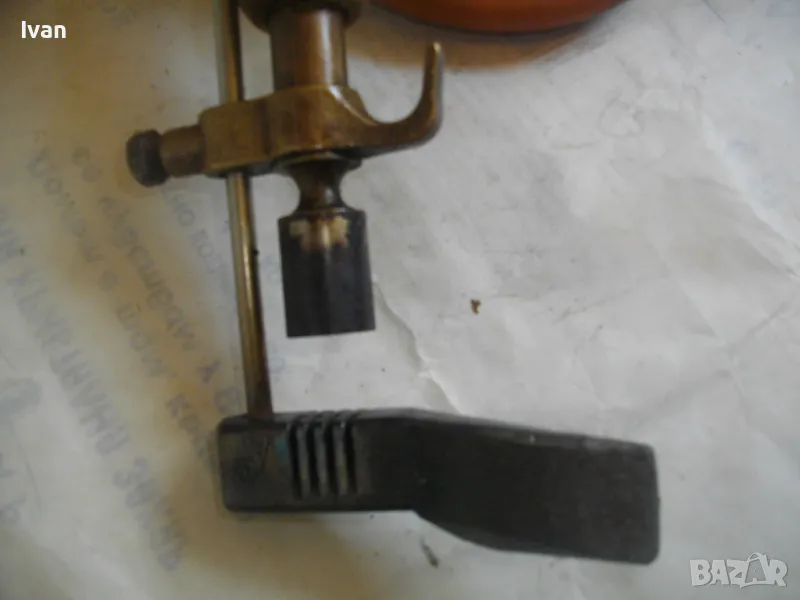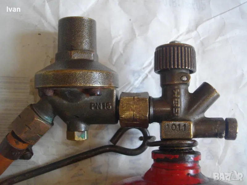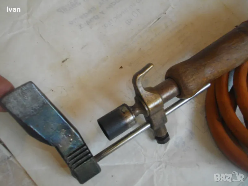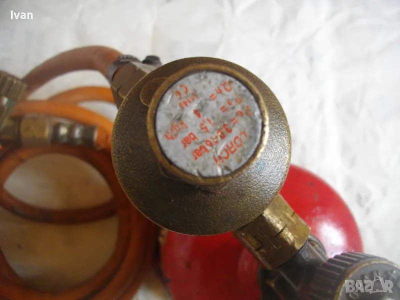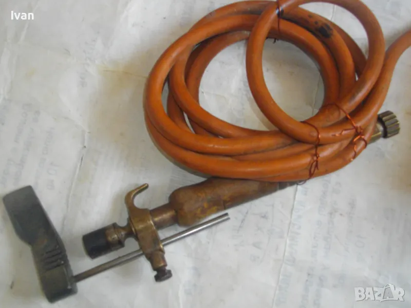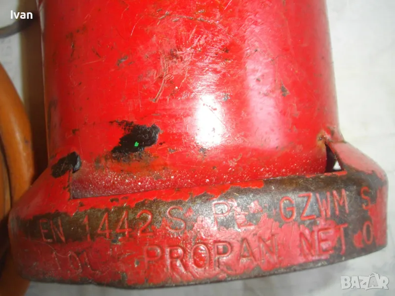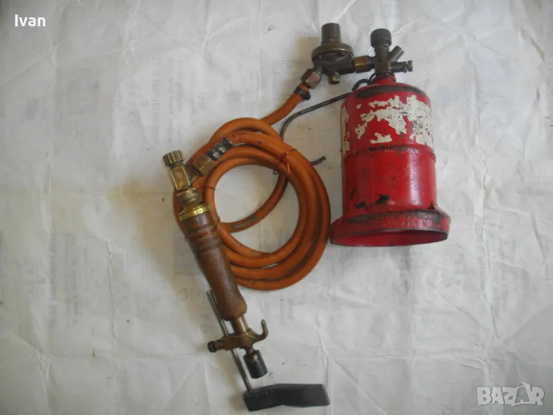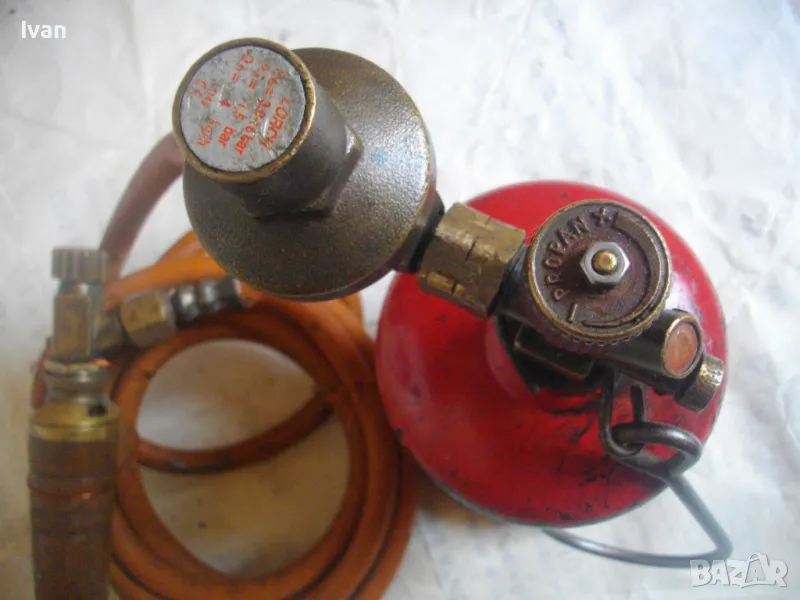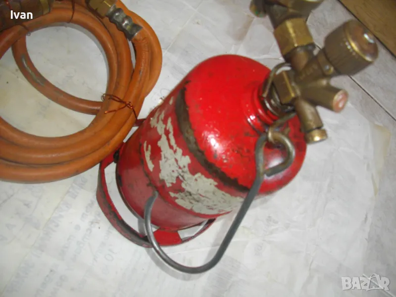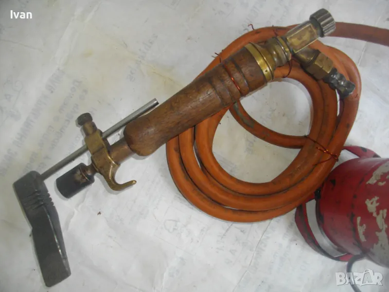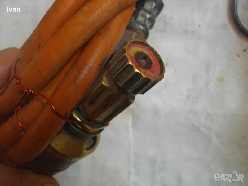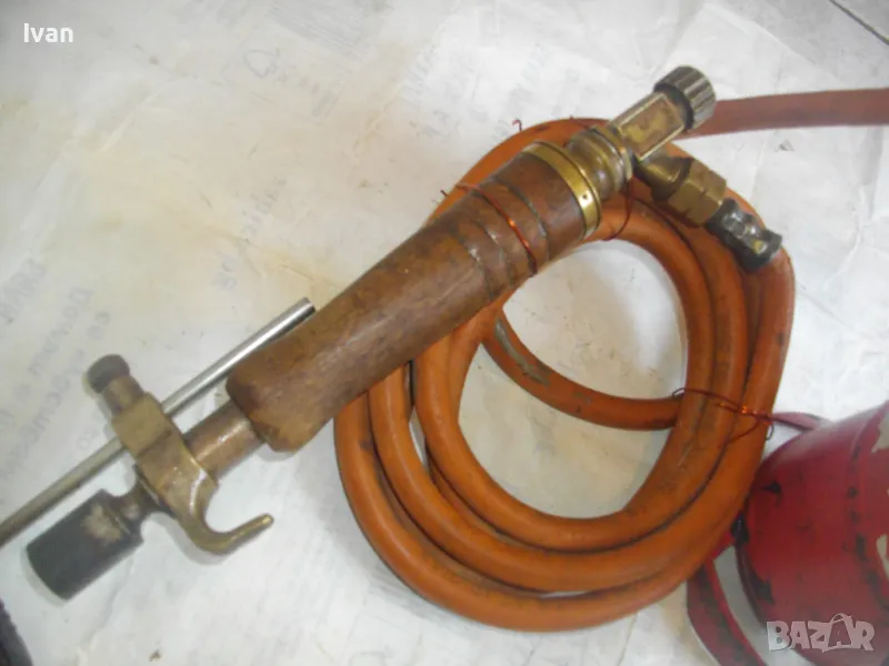 ОПИСАНИЕ на газова горелка с поялник, маркуч, вентил и бутилка газ - цена 299 лв. Пълен комплект с бутилка, маркуч и вентил. Старо немско професионално качество. Почти нов, с много запазен външен вид и отлично работно състояние. В бутилката има малко газ за проба и тест. Бутилка меетална червена 1,24 кг - EN 1442S - 1,0 L - Propan Net 0,425 kg. Височина на бутилката - 20 см, диаметър ф 18 см, с малко газ вътре. Поставен редуцир вентил с щуцер кран оригинални старо качество. Кран щуцерен бронзов марка GOK. С клапан и спирателен кран. Вентил характрестики - Pe- 3,016 bar, Q3-1,5 bar, Qn - 4 kg /h. Марка на вентила - LORCH. Маркуч скачен оранжев дължина 3 м, добър, без напуквания, маркиравки по него - PN 30 bar - 10 /2013г. Скачена горелка газова с поялник над нея. Старо качество горелка с дървено покритие на дръжката и въртеливост изцяло. Запазен външне вид и отлично работно състояние. Почти нова. Дължина с дръжката 32 см, бронз спирателен кран, горелка дюза отпред ф 25 мм с 1 дпука за пламъка. Поляник поставен човка голяма почти нова, дълга 10 см и с дебелина 18 мм, заострена отпред. Глава на горелката изцяло бронзова. Кука стоманена масивна и голяма на бутилката поставена за окачване при работа. Тегло на всичко - 2,5 кг. Цена 299 лв.