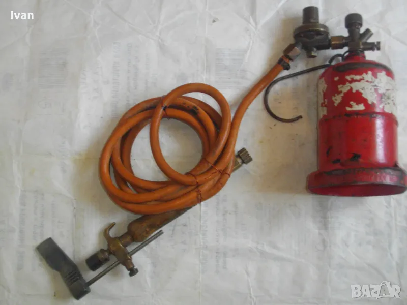 газова горелка с поялник немско старо качество с маркуч, редуцир вентил клапан регулатор налягане и скачена оригинална малка бутилка газова с 1/3 газ за проба - цена 299 лв.