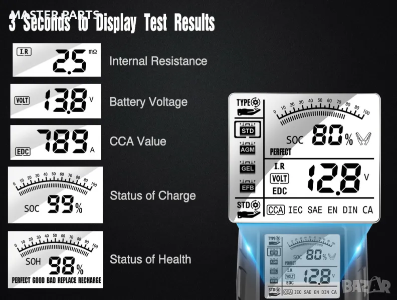 - Интелигентен тестер за батерии: Тестерът за батерии ви помага да определите дали батерията трябва да бъде сменена. Ако акумулаторът на автомобила не стартира, възможно е той да е разреден. Тестерът ще ви помогне да оцените здравето на батерията. Избягвайте сляпата смяна на батерията и ненужните разходи. Оборудването е малко и лесно за транспортиране.