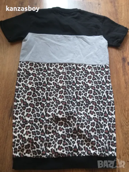 Рокля Guess с животински десен. Роклята е прав модел, който завършва с ластик в долната си част. С къс ръкав, надпис с камъни и лого Guess отпред. Много удобен и практичен модел, съчетан с мека и приятна на допир материя.