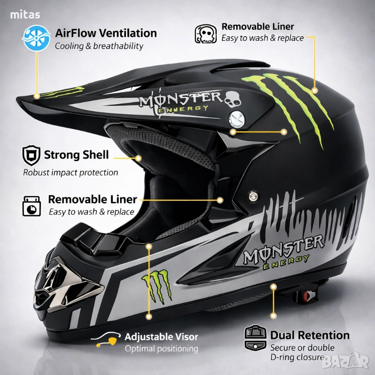 Кросова каска MONSTER, Full Face, DOT Сертификат, Размер: S; M;