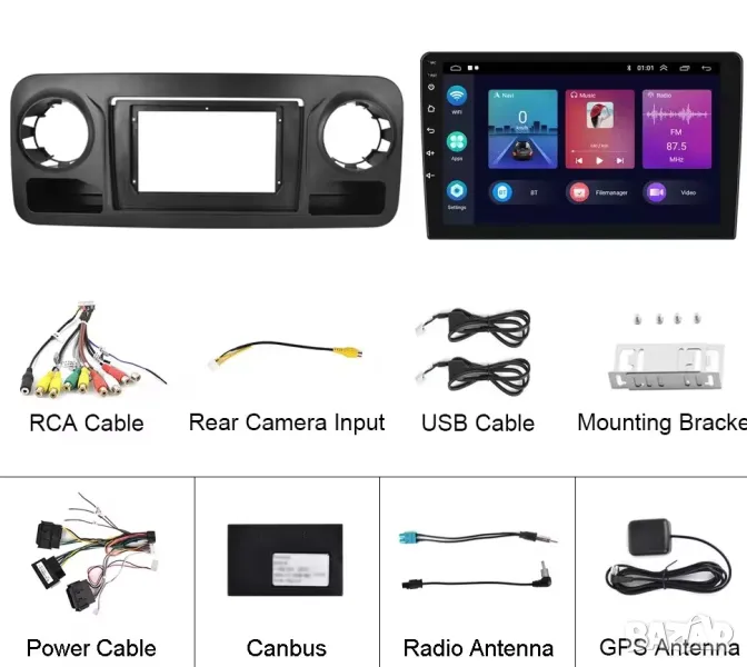 Пълен комплект с цялата рамка, преходни кабели и букси, декодери, предназначени и съвместими за монтиране на конкретния модел автомобил.