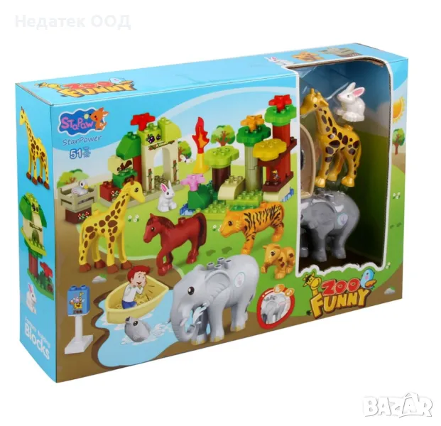 Комплект строителни блокове за изграждане на зоологическа градина със звуков слон, жираф, зайче и други, плюс лодка с риба. Помага за развитието на въображението и креативността на детето, като същевременно развива други умения. Работи с 3 батерии тип AG13 (включени).