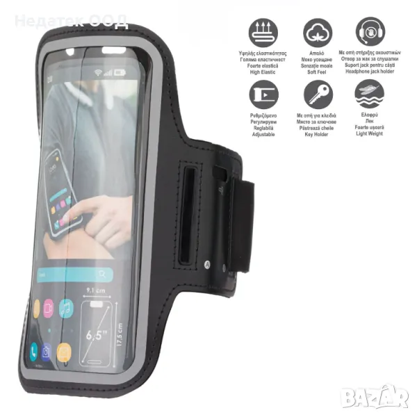 Спортна лента за ръка, подходяща за спорт, изработена от мек неопрен, позволяващ всякакви движения. С подсилени шевове и пришита самозалепваща лента, която осигурява стабилно прилягане и еластичност. Съдържа практично място за съхранение на вашите ключове и слушалки. Включва отвори на гърба на продукта за лесен достъп до слушалките, както и вградени светлоотразителни ленти. Той е силно еластичен, мек, лек с регулируема презрамка.