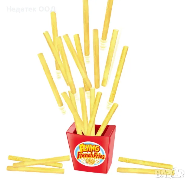 Настолна игра Летящи пържени картофи. Натиснете надолу вътрешната основа и поставете всички пържени картофи в кутията с кръглия край надолу. Играчите се редуват да изваждат картофите един по един. Издърпайте грешните пържени картофи и ще ги видите как експлодират! Пакетът за пътуване ви позволява да го носите винаги с вас.