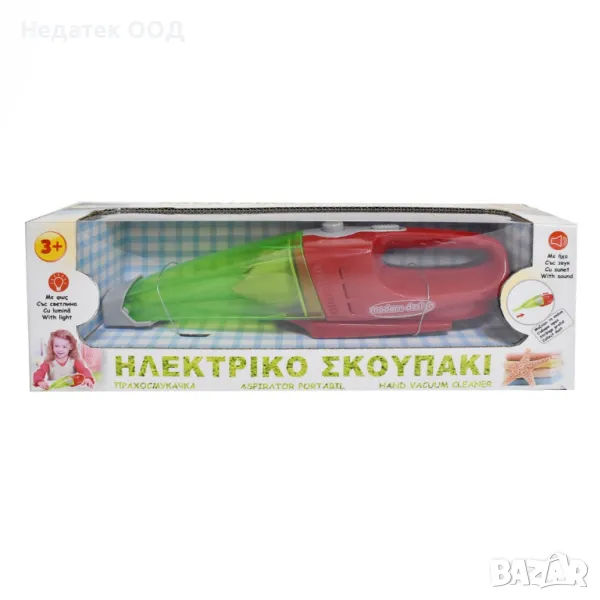 Детска пластмасова метла, която събира прах и накрайника се сваля с копчето. Има работни звуци, светлина и бутон за включване/изключване. Работи с 2 батерии АА (не са включени).