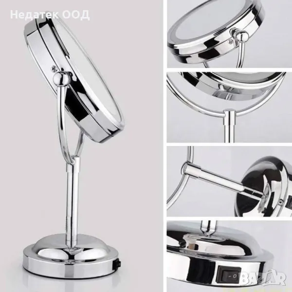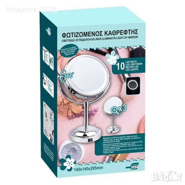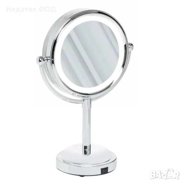 Двойно настолно огледало (обикновено и x3 увеличение), 4.5V, 0.7W, с хромирана желязна рамка, въртящо се на 360º и 10 светодиода (6000K). Има бутон за включване/изключване, работи с 3 батерии АА (не са включени) и има USB порт. Помага ви лесно да видите дори порите си, докато използването на светодиоди ви позволява да се гримирате дори през нощта. Диаметърът на огледалото е 11.5см
