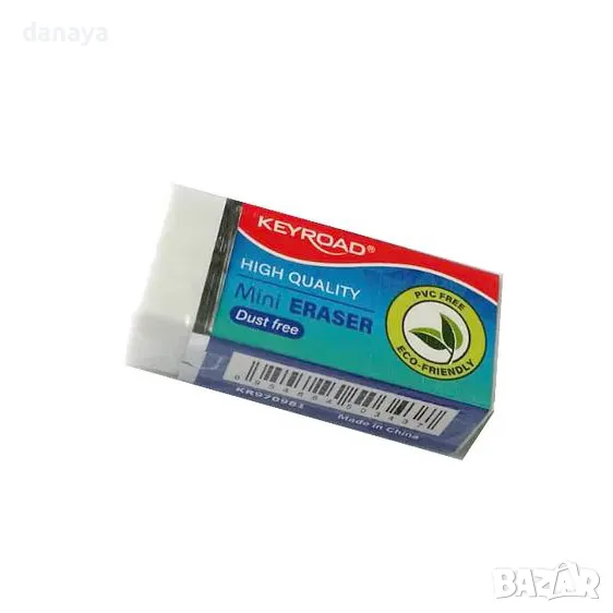 Малка ученическа гума Keyroad. Гумичката Keyroad Mini Eraser е компактна и ефективна, идеална за прецизно и чисто изтриване. Перфектен избор за ученически несесери и офис принадлежности, тя предлага удобство и качество на достъпна цена. Малкият ѝ размер я прави лесна за пренасяне навсякъде, а гладкото ѝ действие гарантира, че ще премахнете грешките без усилие и без следи. Отличен аксесоар за всеки, който цени точността и практичността! Изработена без съдържание на PVC, тази гумичка е екологично чиста и безопасна за употреба.