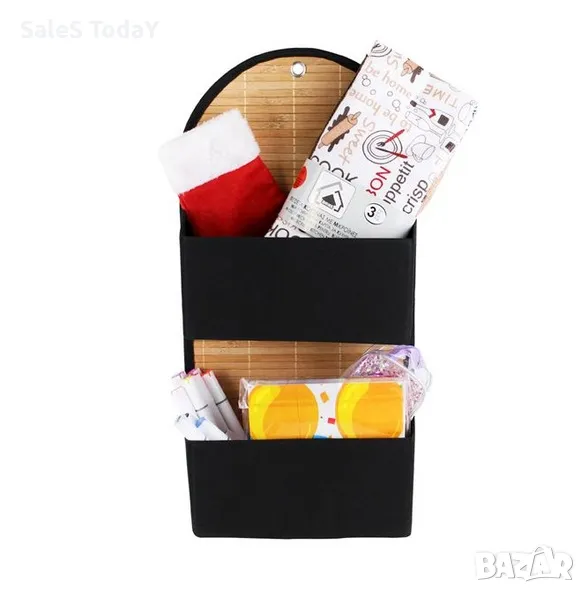 Калъф органайзер с бамбуков гръб и черен плат в калъфите (22x11x10см). В горната част има метална халка за монтаж, както и метална кука за врата на шкаф/гардероб (с максимална дебелина 3,5 см).