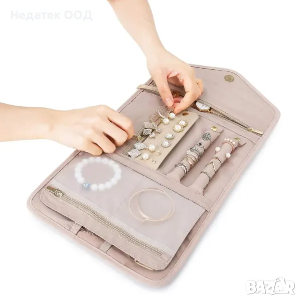 Бежов ватиран портфейл органайзер за бижута. Има 5 различни отделения: с дълги поддържащи ролки за пръстени, основа с дупки за обеци, джобове за копчета за верижки/гердани и вътрешни джобове с цип. Той организира и защитава бижута и вериги, лесен е за транспортиране, идеален е за пътуване и работа и можете да го използвате и за показване или представяне на бижута. Закопчава се с метално копче.