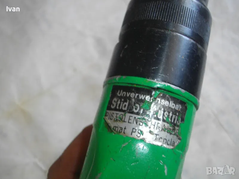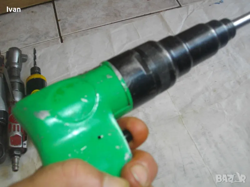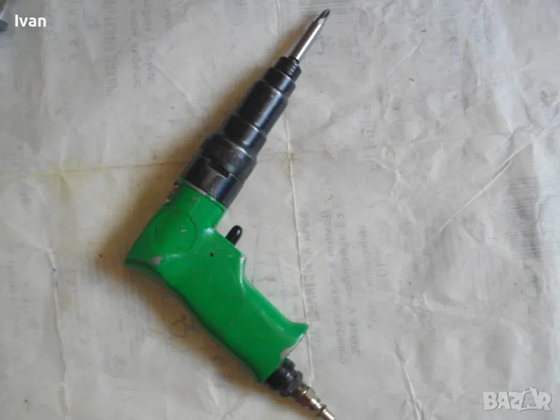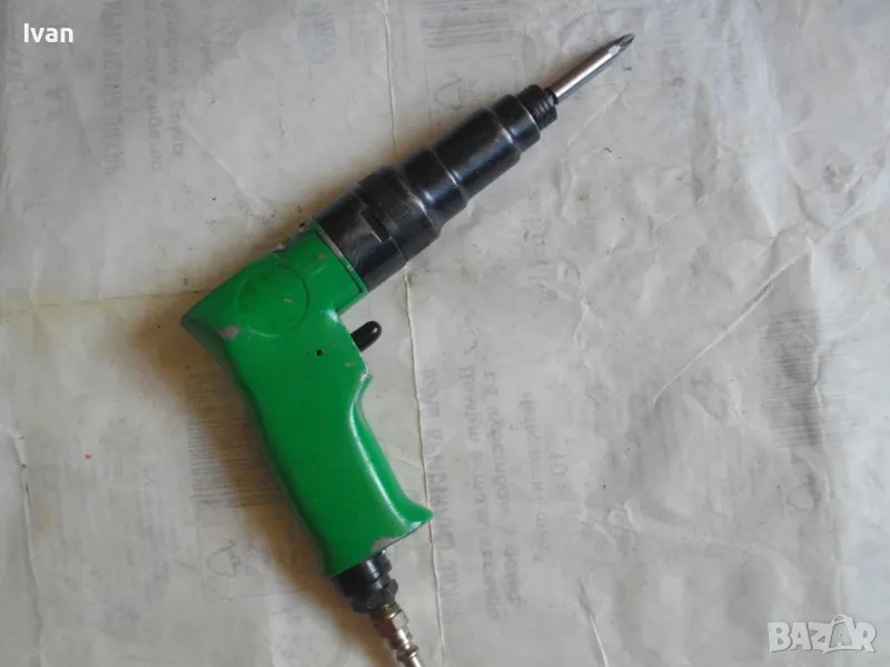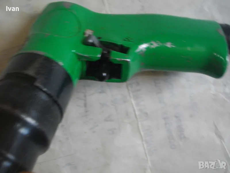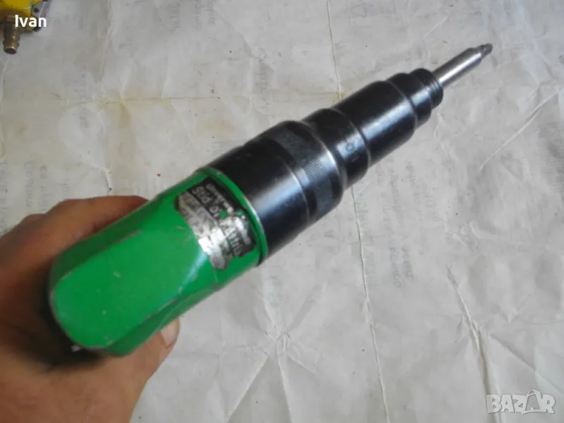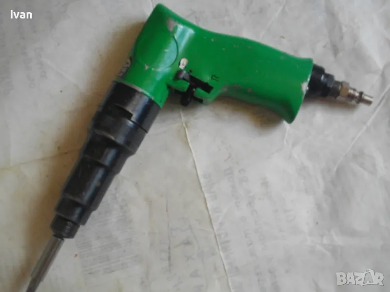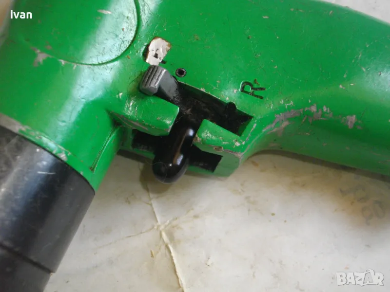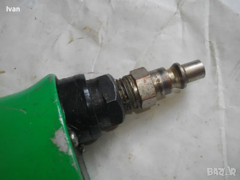 ОПИСАНИЕ на зелен пневматичен винтоверт с клик-клик бърза връзка патронник - 59 лв. НЕ РАБОТИ, не тръгва на копресор - има ссчупена детелина зад спусъка вътре, от претоварване на високи атмосфери. Цена в това състояние - 59 лв..