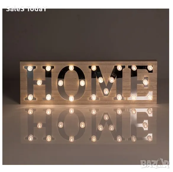 Настолна декоративна дървена табела в естествен цвят с надпис Home с огледални букви и топла светлина от 21 LED крушки. Има бутон за включване/изключване. Работи с 2 батерии AAA (не са включени).