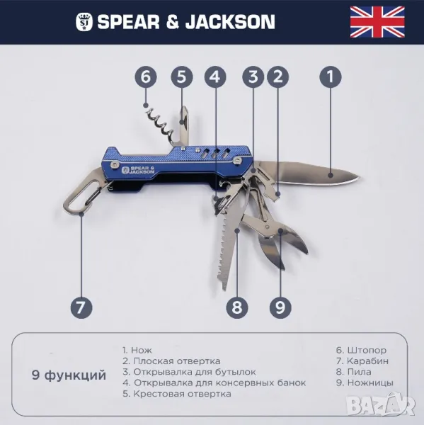 Мултиинструмент Spear & Jackson, къмпинг сгъваем нож, 9 в 1