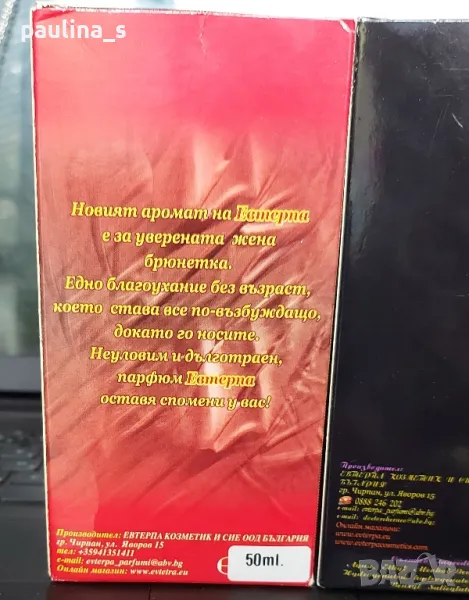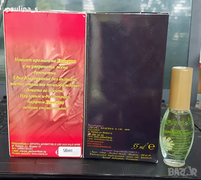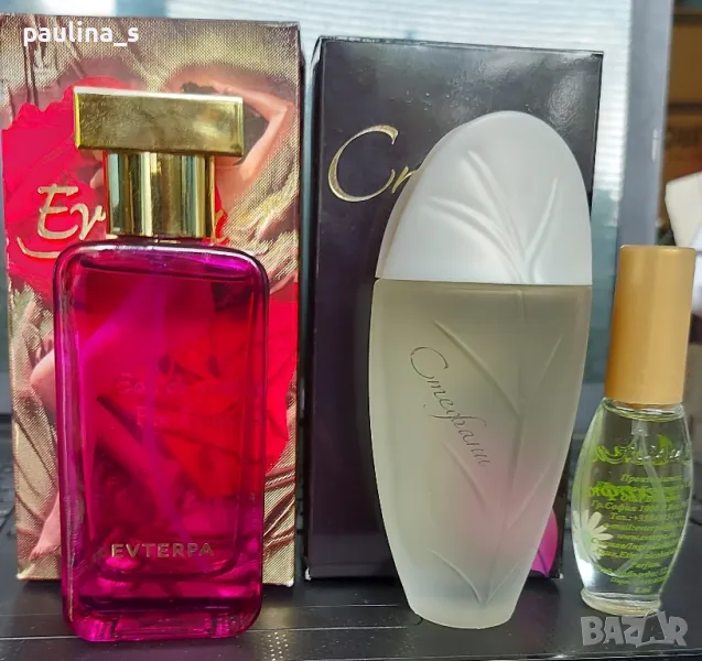 Евтерпа - българските парфюми с натурални етерични масла. Парфюмите са нови, пръснато е за проба по веднъж от два от тях.