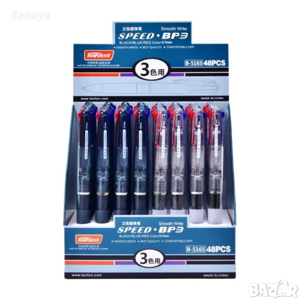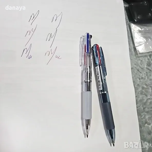 3 цвята в 1 химикалка: черен, син, червен.
