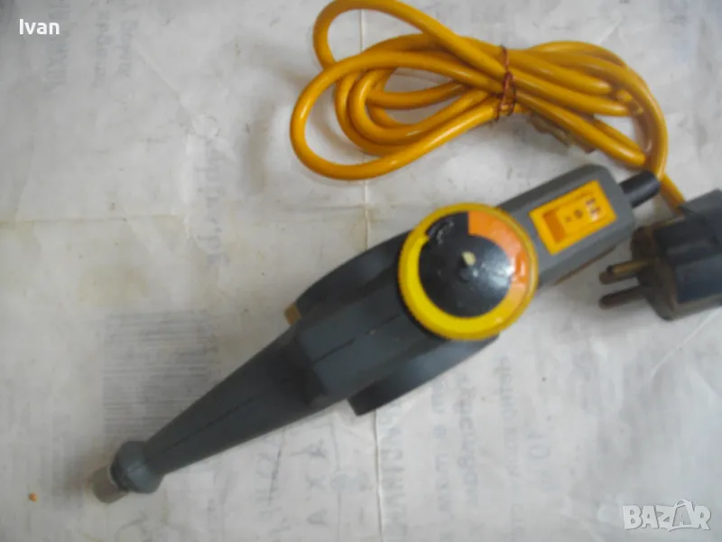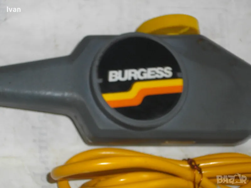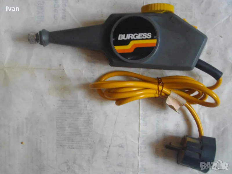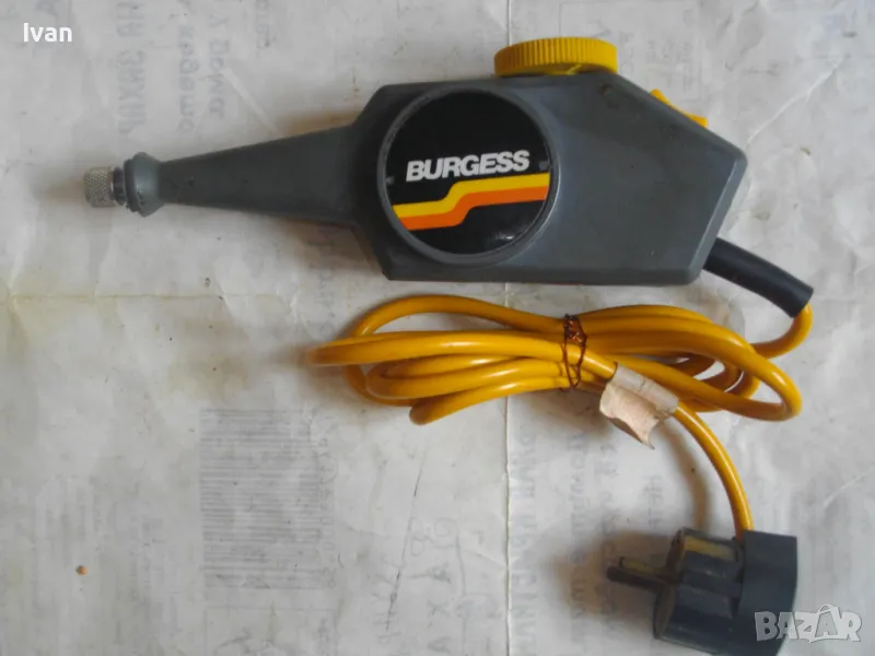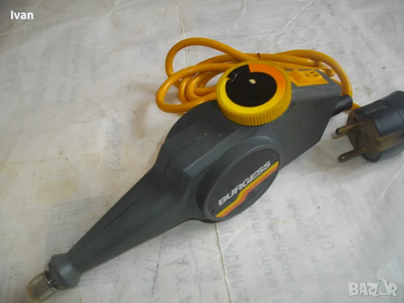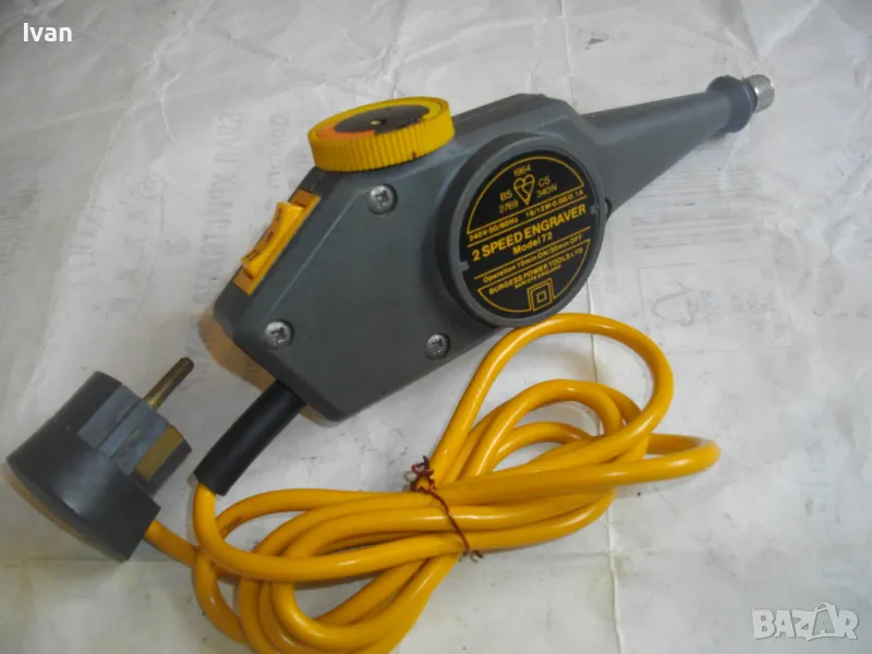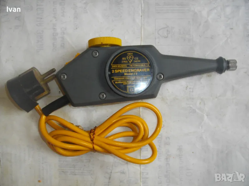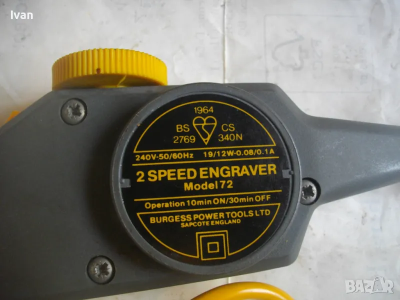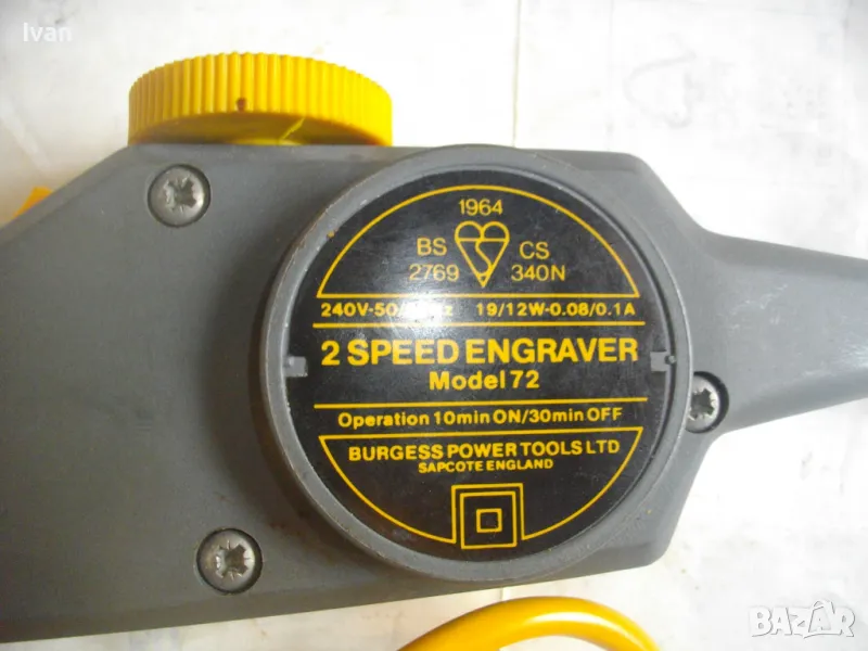 BURGESS Power Tools England LTD. Много запазен външне вид, почти нова, в отлично техническо/работно ъсстояние. Граврането се осъществува на принципа ротационни движения на главата /напред-назад/ 2 скорости /бавна-бърза/, потенциметър регулация на скоростта. Мощност вписана - 19/12 вата, защита 0,08/0,1 А. Време на работа с 1 пуск - 10 мин. Време на изключен режим - 30 мин. Оригинален захравнащ оранжев кабел гумиран, оригинален щепсел. На стикера има маркировка за марката като година произовдство 1964. Глава на машината - с цанга и притягаща гайка като на амшина ел.мни дрелка-шлифовалка. Размер на цангата за поставяне на аксесоар за гравиране - 5 мм. Машината е без аксесоари.