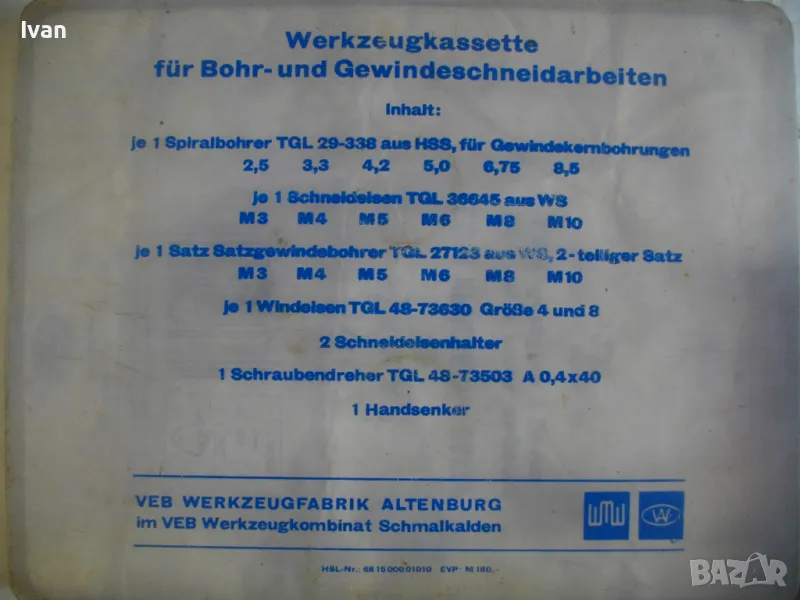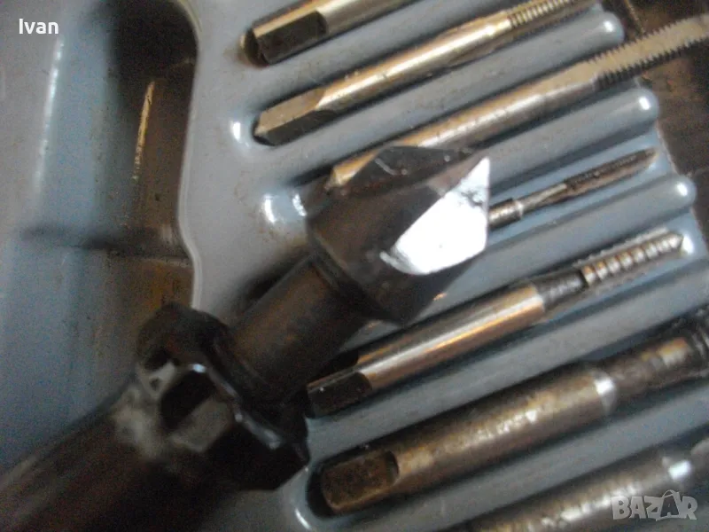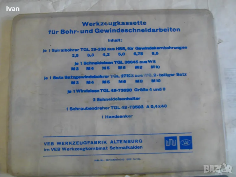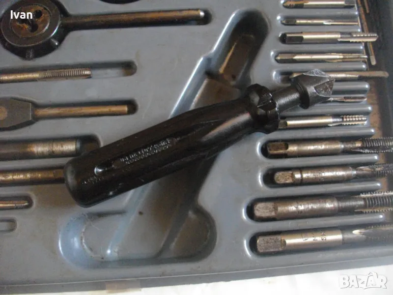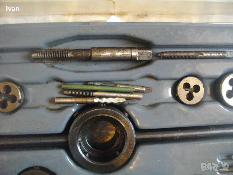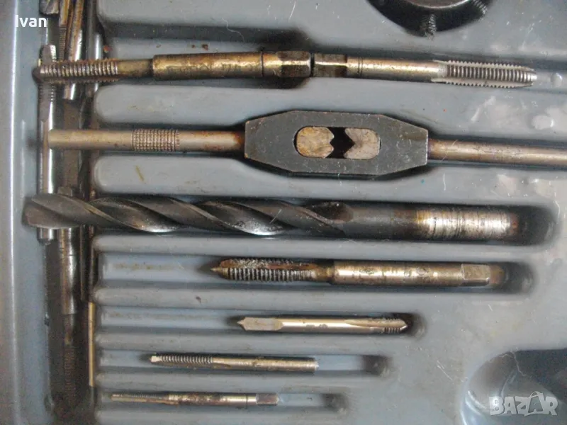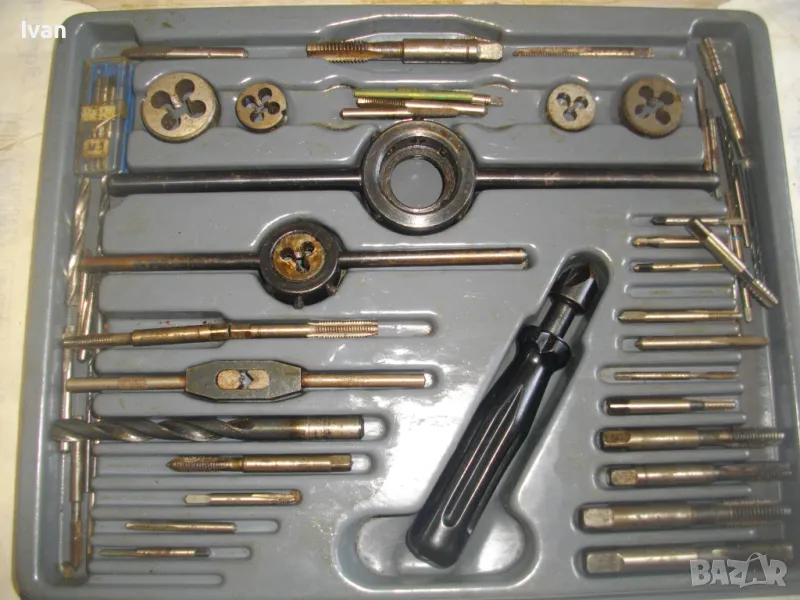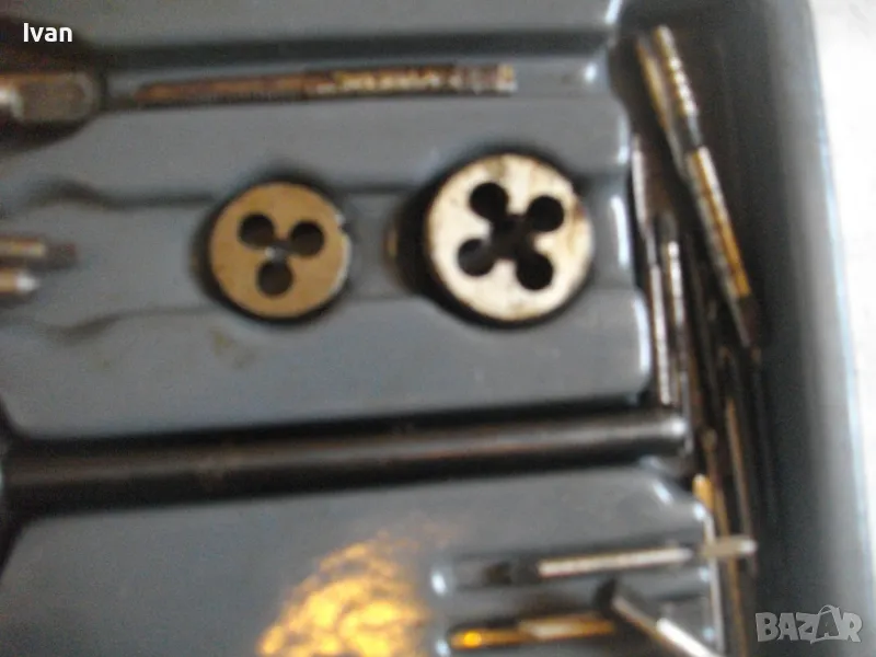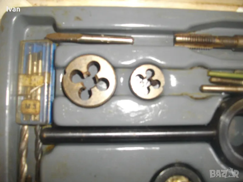 ОПИСАНИЕ на голям 58 части немски комплект за резби - старо качество - професионален VEB - в ПВЦ кутия голяма - 259 лв. Старо качество, немско производство на ГДР комплект метчици и плашки за външни и вътрешни резби от 2,5 мм до размер М10, висок клас доказало се във времето производство професионално на VEB.