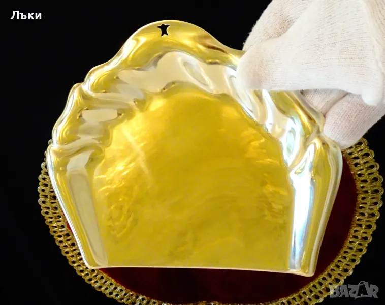 от високо качествен месинг с позлата.Декорирана с красив кован релеф.Дължина 14.5 см.,ширина 17 см.,височина 1.5 см.Тегло 115 гр.