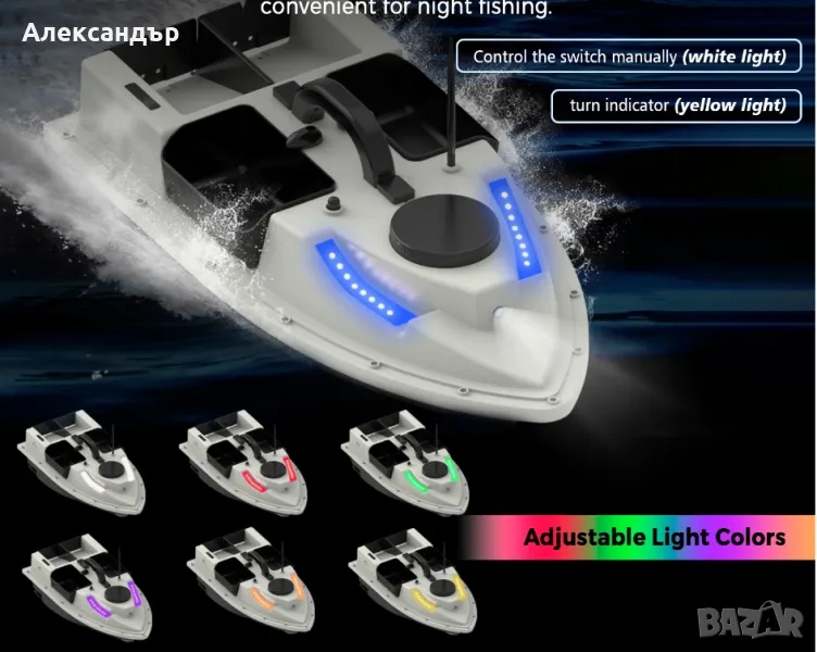 Отпред е направен по-голям кил, за по-голяма стабилност на лодката при вълни. GPS произволно позициониране на 99 точки . Автоматично връщане при недостиг на батерия: Когато дистанционното управление е с изтощена батерия, батерията на лодката е недостатъчна, или сигналът е загубен, лодката автоматично ще се върне към началната точка. Beidou + GPS двойно сателитно позициониране 99 бр GPS точки за запаметяване Истински 500 метра обхват Система за круиз контрол Устройството жироскоп автоматично коригира скоростта, стабилизира корпуса и поддържа права линия при вятър и вълни. 4 бр независимо управлявани контейнера, 3 кг товароносимост за хранене. Предни и странични нощни светлини, за позициониране на супер дълги разстояния. ABS инженерен материал: нетоксичен и безвкусен, силна устойчивост на удар и устойчивост на абразия. Максимална скорост: 10km/h