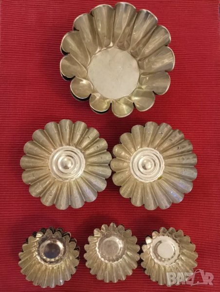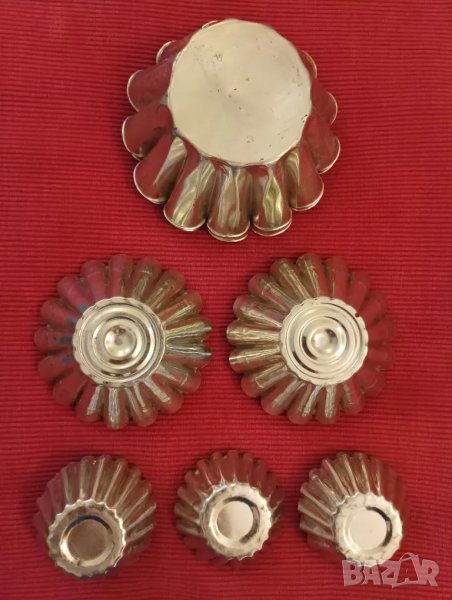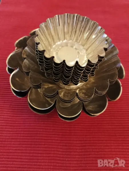 Сет форми за сладки, кошнички от бяло тенеке, старо производство. Размери :10 броя доло 4 см, горе 7 см, височина 3 см, 4 броя доло 5 см, горе 11 см, височина 5 см, 2 броя доло 8 см, горе 14 см, височина 6 см. Общо 16 броя. Отлично състояние, няма забележки. Еконт, Спиди, лично предаване.