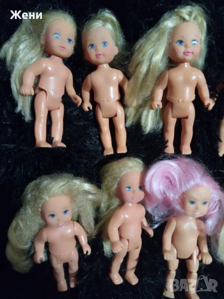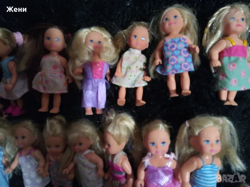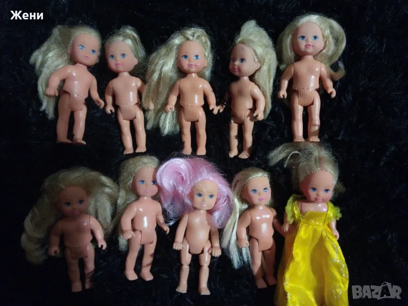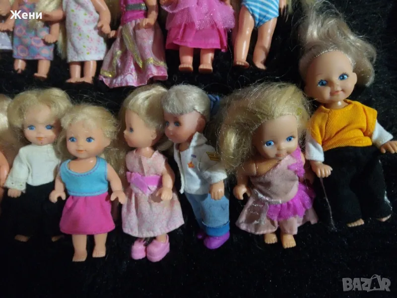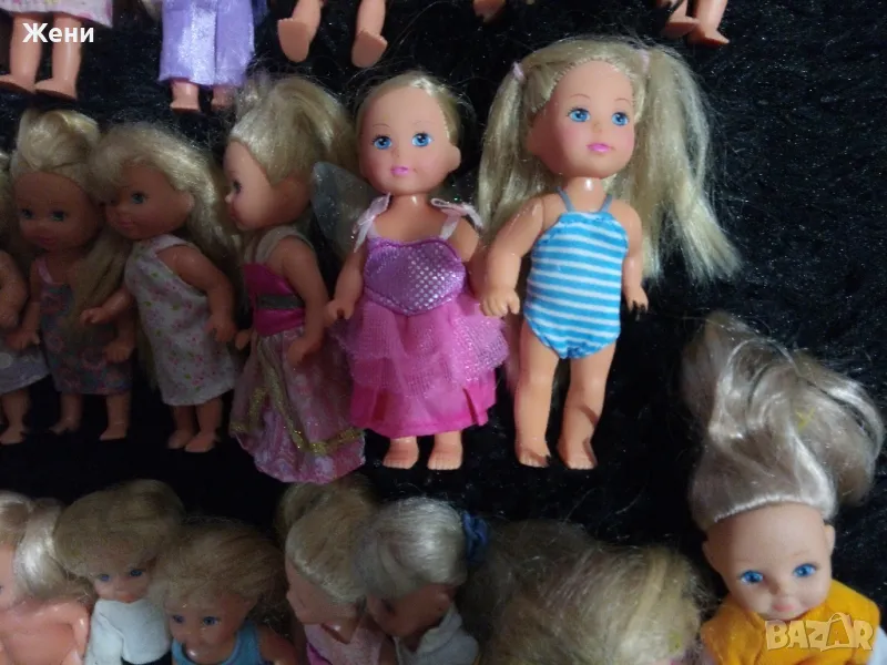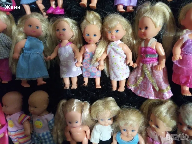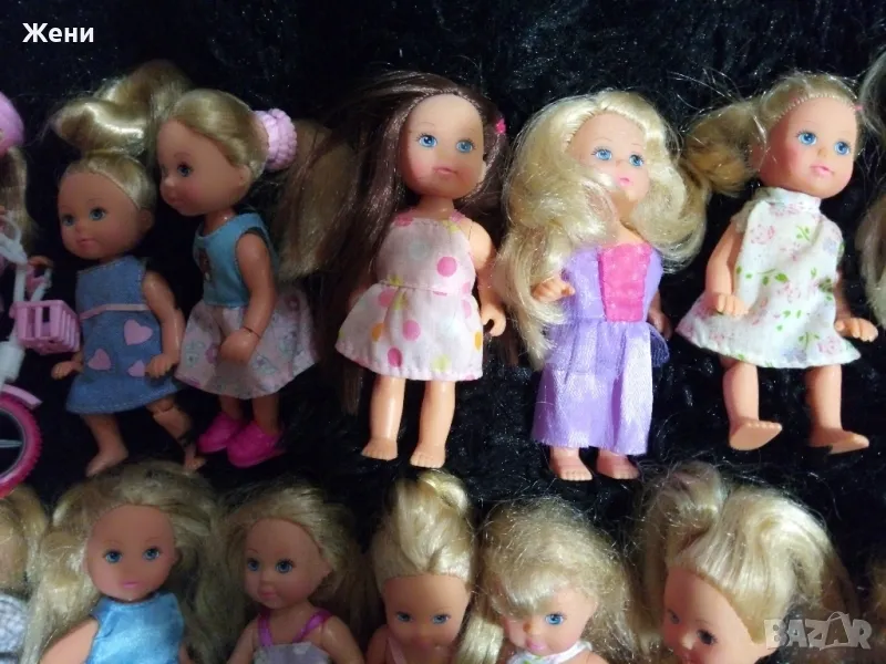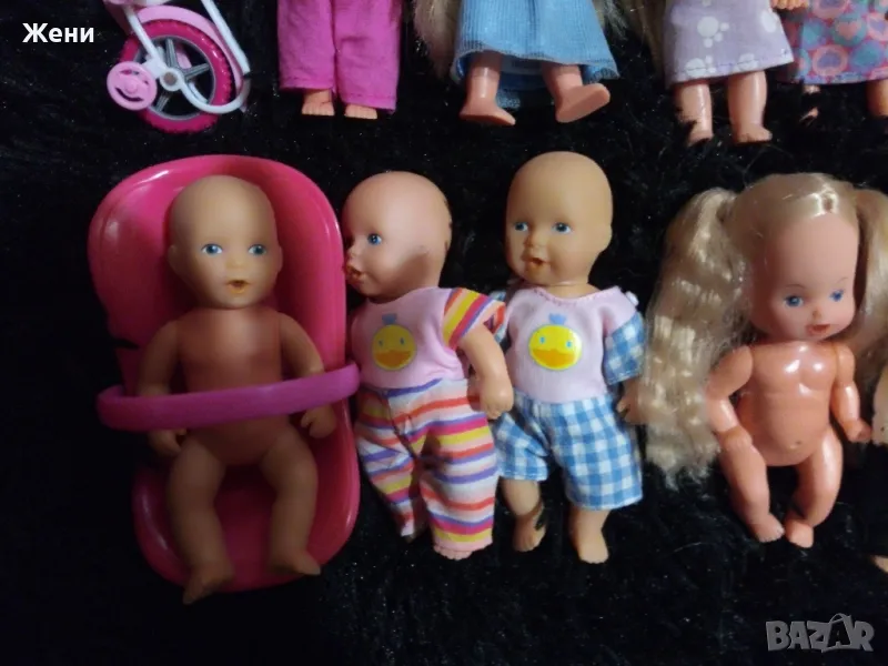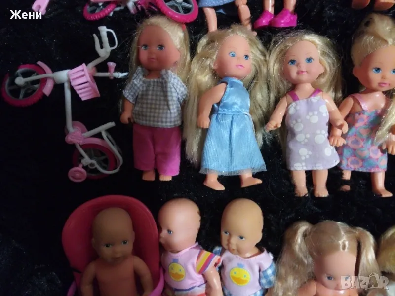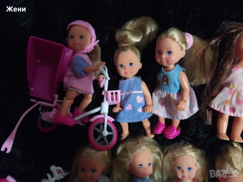 Всички куклички са на марката Simba. Цена 2€ за брой. Двете облечени бебета и ретро кукличката до тях са продадени. Ретро куклите (последните 6 кукли) са по 2,5€. Колелото с ремарке 2€, другото, без седалка - 1€.