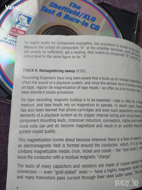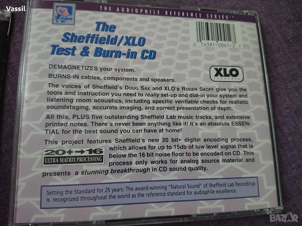 Sheffield / XLO Test & Burn-In CD, made in USA (първоначално издаден през 1994 г., често чрез Reference Recordings) е водещ аудио инструмент, предназначен за диагностика, калибриране и разсвирване на висококачествени аудио системи. Той включва специализирани записи за балансиране на каналите, фазиране, демагнетизиране и системно разсвирване (burn-in), както и подбрани висококачествени музикални записи.
