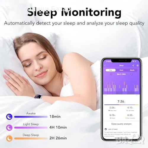 Здравен мониторинг: Постоянен контрол на сърдечния ритъм и качеството на съня.
