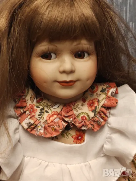 Страхотна порцеланова кукла от 70 те години.Очарователни трапчинки наситени цветове.Висока 50 см Никога е нямала стойка.За колекционери.В перфектно състояние може само да се освежат дрехите.Крайна цена