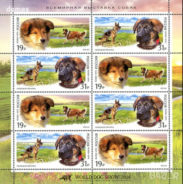 Включва 8 Блок марки Световна изложба на кучета. Служебни кучета.