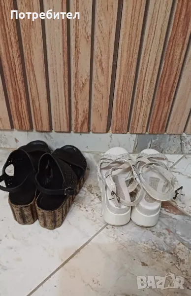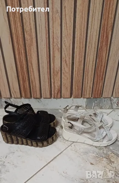 Два чифта сандали естествена кожа с номера 36, височината в предната част е 2,5 см, а задната част 7 см. Намират се в отлично състояние. Цената е 20 лв за чифт.