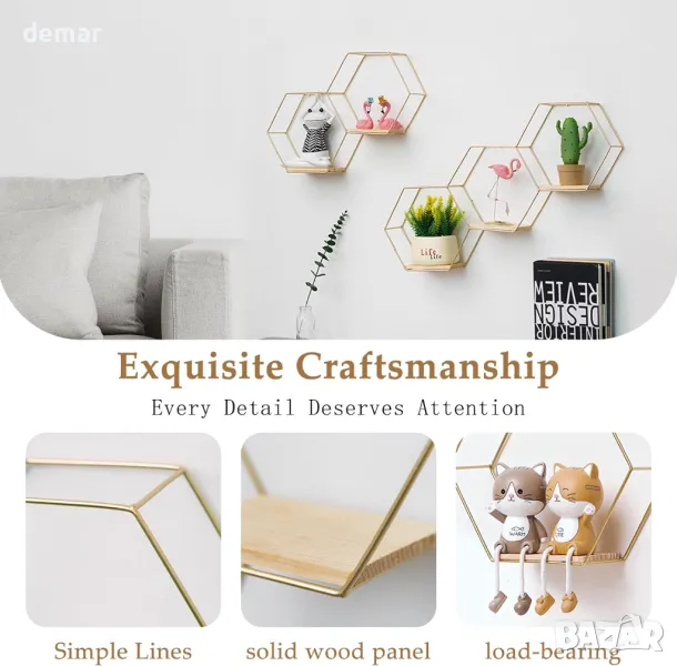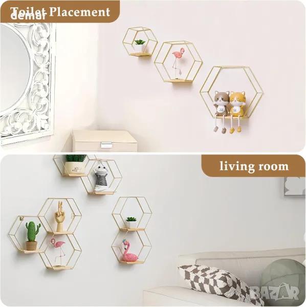 Комплект Alitopo от 3 шестоъгълни стенни рафта, метални и дървени плаващи рафтове