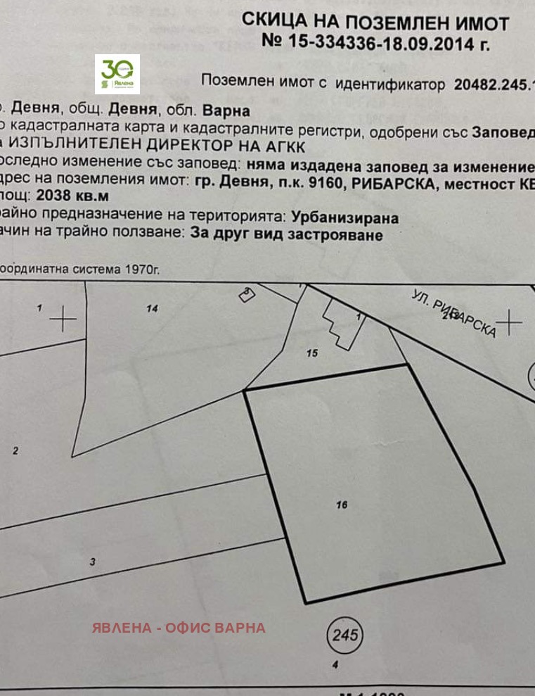 Явлена предлага за продажба равен парцел в гр.Девня кв.Повеляново с площ 2038 кв.м до главен път.Подходящ за стоителство на къща или с друго предназначение. В близост до промишлена зона.Ток,вода и канал на границата с имота.В района се живее целогодишно.Нсаленото място е сдобри транспортни връзки и има всички необходими удобства за целогодишно пребиваване(магазини,аптеки,автобусна спирка,църква,поща,автосервиз,бензиностанция,училище,стадион,детска площадка)______________________________________________________________________