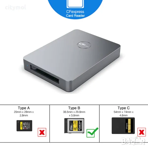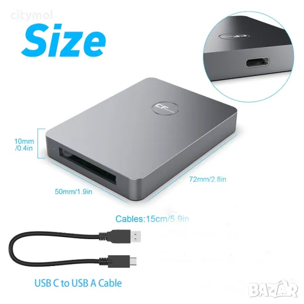 Професионалният четец CFexpress Type Bсе доставя с USB A към USB C кабел, предназначени да позволят на едно устройство да бъде съвместимо с всички разновидности на MacBook Pro, Mac Air, компютър, преносим компютър и други.