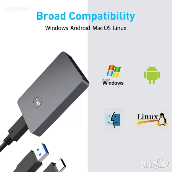 Съвместим с Windows XP/Vista/7/8/8.1/10/11, Mac OS и др. Plug & Play, с възможност за гореща смяна; Не е необходимо външно захранване, захранва се от USB шина, лесно и удобно за носене и използване от фотограф и видеооператор.