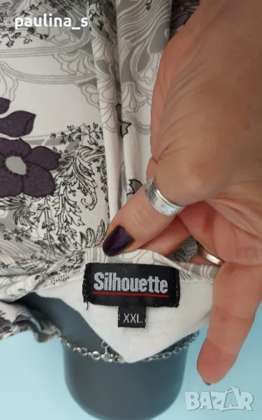 1. 2XL / 4XL - "Silhouette". Цената е крайна 24,99лв. Маркова еластична блуза тип туника с флорален принт от памук и ликра. Материята е фино трико, има еластичност и покрива няколко размера, посочени са. Една бройка е, без дефекти и етикет. Колието Версаче е на цена 19,99лв