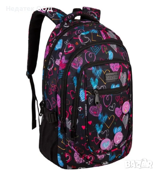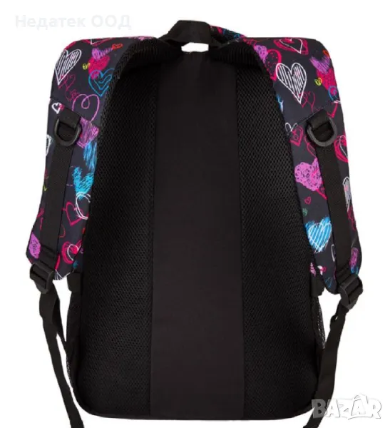 Ученическа раница, черна с десен на цветни сърца. Има 3 джоба със здрави ципове и метални закопчалки. Голямо подсилено отделение за лаптоп, интегрирано в основното отделение, 3 джоба за органайзер за значки в лилав цвят на предното отделение и 2 джоба отстрани. Има анатомичен гръб и ергономични презрамки.