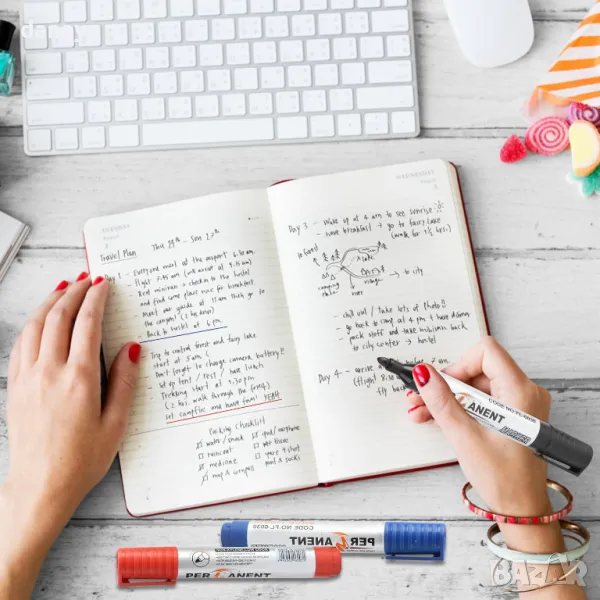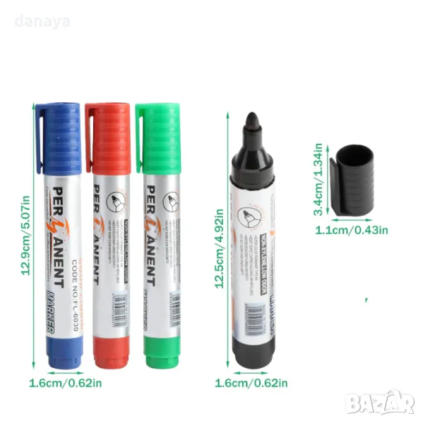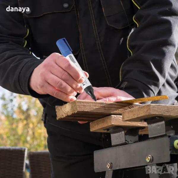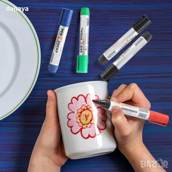 Перманентен маркер, подходящ за нанасяне върху гладки повърхности, като стъкло, дърво, метал или картон. Тялото и капачките са изработени от полипропилен (PP), който предпазва мастилото от бързо изсъхване.